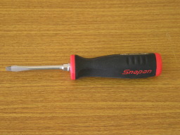 | マイナスドライバー 内モンゴルの糸巻きを交換する時の必需品です。 裏側をマイナスネジ1本で締めてあります。普通締めた後、上から塗料が塗ってあるので、かなり固着しています。 自動車整備用の精度の高いものを使用しないと、使われているネジが柔らかいので、なめる(溝が崩れる)原因になります。 |