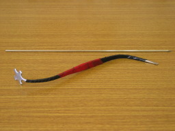 | 魂柱立て&補助針 魂柱を立てる・位置を調整する時の必需品。バイオリン用を流用。 F字ホールの木部保護の為、金属部にビニールテープを巻きます。 通常バイオリン工房では、魂柱立ての片側の刃のみで立てますが、訓練を積まないと難しいです。が、この針に魂柱を刺して立てたい位置に左手で保持し、右手の魂柱立てで魂柱の下部を押し込むと、かなり楽に立てられます。 また補助針は、倒れた魂柱を刺して取り出すときにも、便利です。 この針は、手元にあった金属棒の先端をヤスリで尖らせました。入手しやすいものを探したところ、東急ハンズに畳針がありました。 この針は、モンゴル国の馬頭琴の、糸巻きに通して止めた「弦のこぶ」を解く時にも重宝します。 |