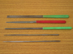 | ヤスリ各種 平らな物は駒の高さ調整・上駒の製作等、 半円の物は駒の接地面の調整等、 細い丸棒は、駒の弦を乗せる溝を彫るのに使います。 |
