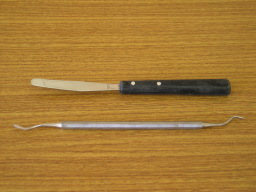 | ペインティングナイフ&? たしかプラモデル用の物だと思います。 隙間の接着や薄く接着剤を延ばすのに便利です。 下の「?」は、隙間を広げて接着剤を塗りやすくします。 |