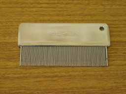 | 櫛(猫用) 弦交換の時、音叉でおおよその絡みをとった後、更に弦の絡みを梳いて整えます。ホテルのプラスチック櫛→柘植の櫛→たまたまあったネコの毛梳き用の櫛、使ってみたところ、細かさが最適でした。 |