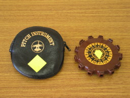 | チューナー(笛型) 耳の訓練用に使用します。「G]のところに蛍光テープを張って、判別しやすくしています。 演奏の時は「SEIKO製」のものを使っています。頻繁に使うので通常は馬頭琴ケースに入れています。 ボディ貼り付け形「EDM」は、誤作動が多く今ひとつ。BOSSの12Hも、馬頭琴には少し神経質過ぎるようです。 お勧めは、KORGのDT−3 |