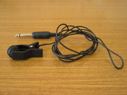 | コンタクトマイク(クリップ式) クリップ式のコンタクトマイクを付けて置けば、大勢で練習中でも、チューニング可能です。 貼り付け型もありますが、おそらく振動の為でしょう、落ちてしまいます。 |
