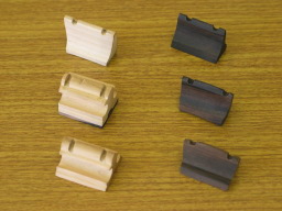 | 下駒素材 自分の愛器には、最適な駒をセットしてあるので、これも主に、新しい楽器の調整用(音質・高さ)です。 内モンゴル用にビオラの駒各種(硬めから柔らかめの物まで)、モンゴル国用に主にアルゴサン工房のものを用意しています。 ビオラの駒は一般的に、硬め・色が茶色・寝かせてあるものが良いとされていますが、馬頭琴にこの公式は当てはまりません。 切った端材は、高さをあげる時の素材として保管します。 |